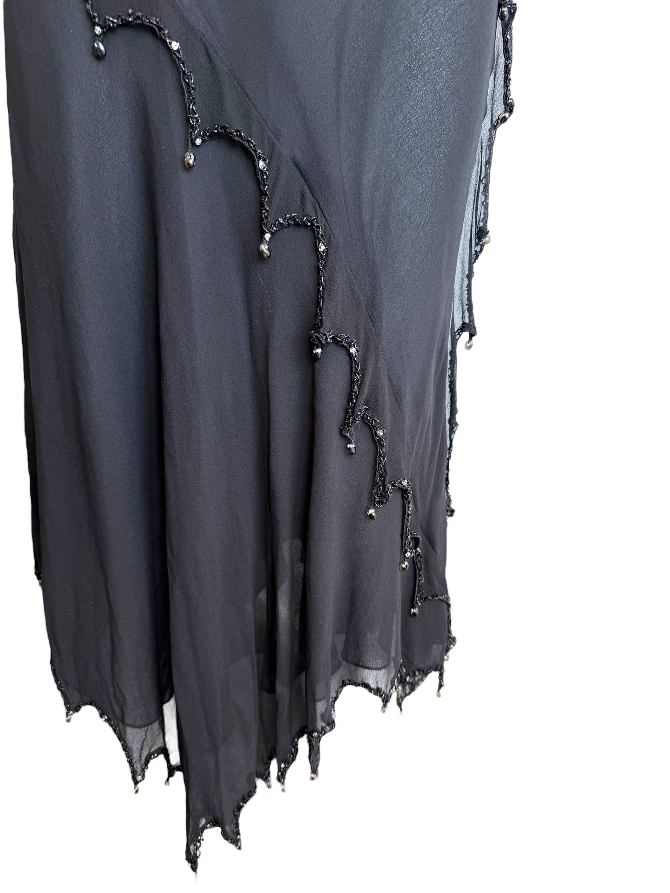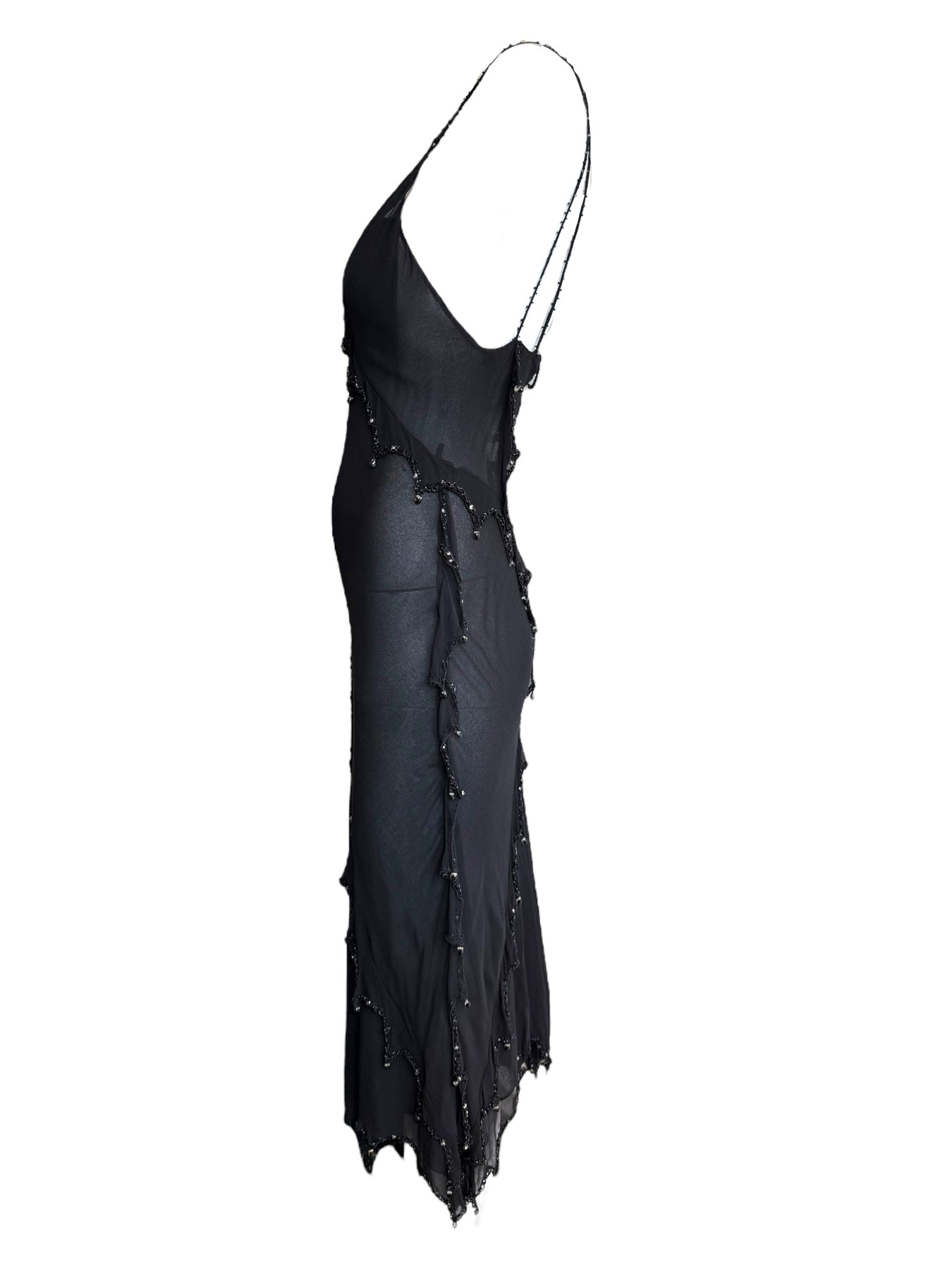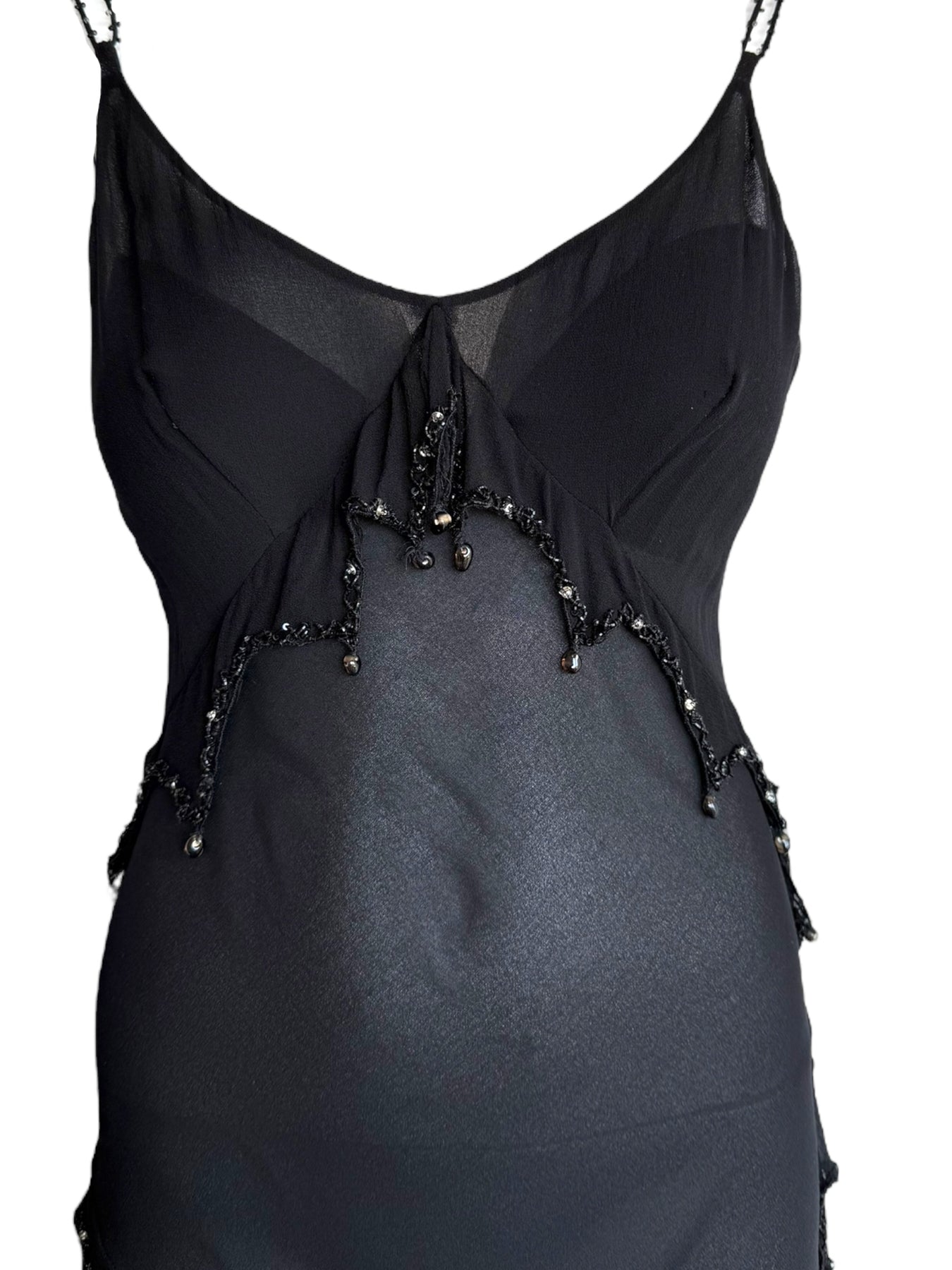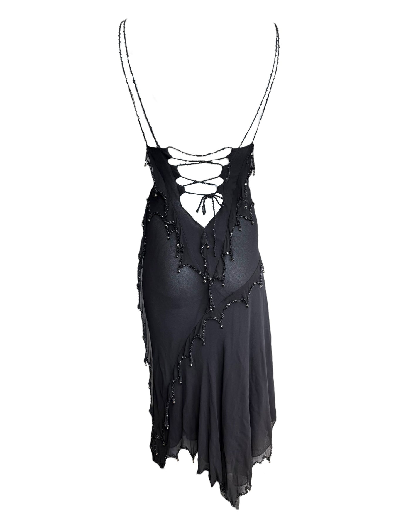 A Roberto Cavalli dress from the Spring/Summer 2003 collection, crafted in fluid black silk with delicate hand-beaded trim and an asymmetric hem. This sensual piece features a sheer silhouette with sculpted overlays, and includes discreet padding added for modesty due to the semi-sheer fabric. The open back is finished with adjustable lace-up straps for a custom fit and added drama.