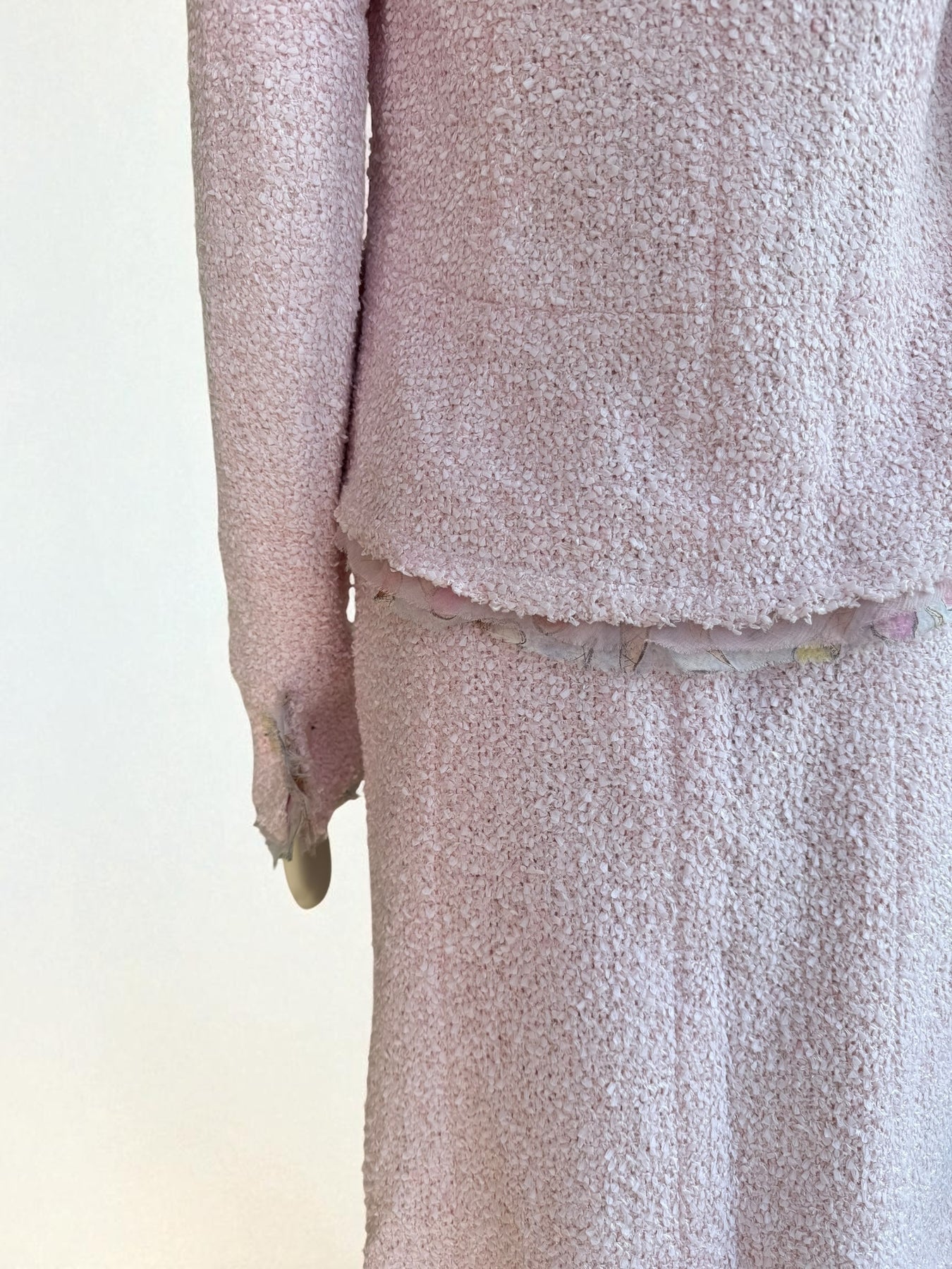 Chanel 04C pink tweed skirt suit from the Resort 2004 Collection, featuring signature boucle texture with delicate chiffon petal trim along the collar, cuffs, pockets, and front edges. A timeless, feminine silhouette that captures Chanel’s refined elegance with a playful twist.