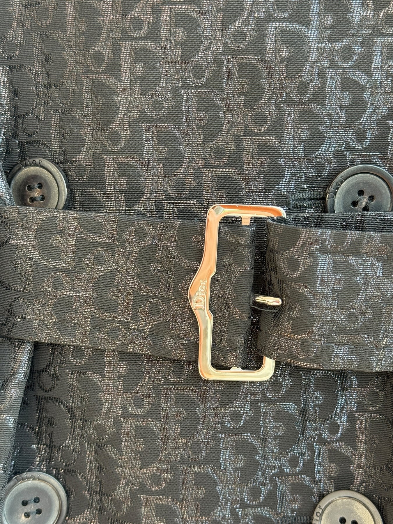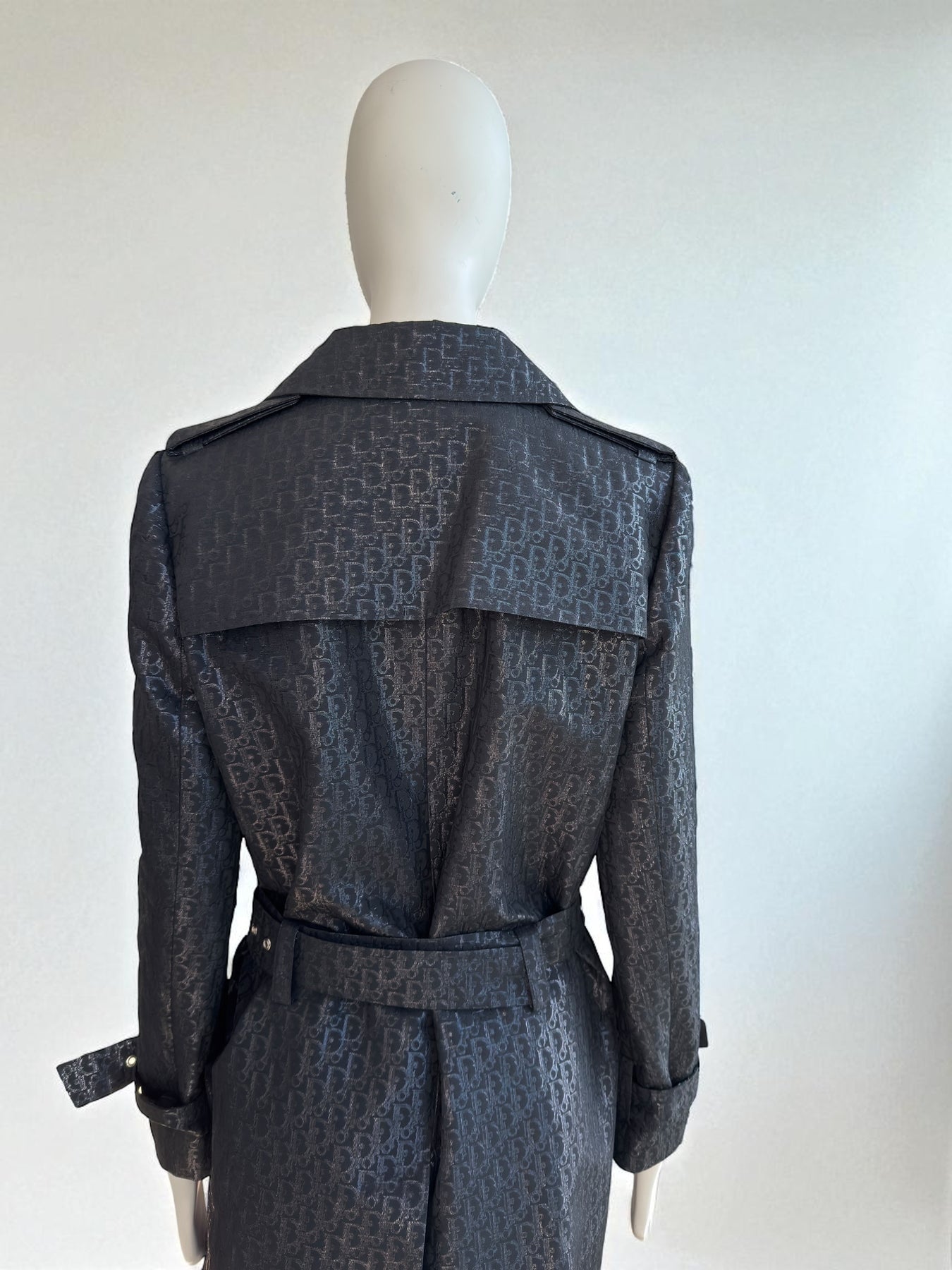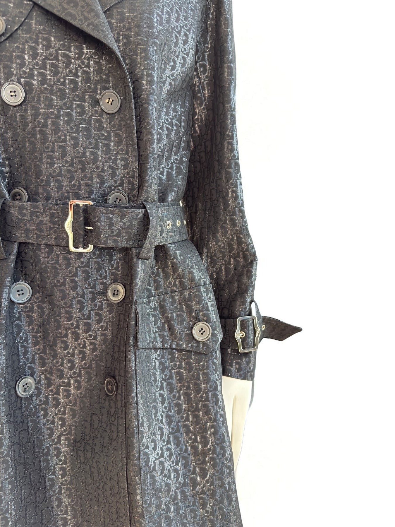 A stunning Christian Dior Spring/Summer 2005 trench coat crafted in France from a luxurious jacquard fabric featuring the iconic Dior logo pattern. Designed with a classic double-breasted front, belted waist, and adjustable cuffs, this piece perfectly balances structure and sophistication. The subtle metallic sheen woven into the fabric enhances its depth and texture, adding a modern touch to a timeless silhouette.